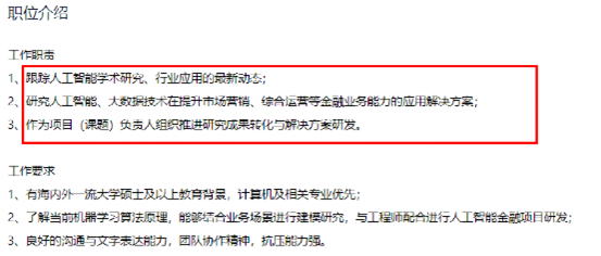 也有公司在实名招聘.。如创金合信基金就在寻找机器学习开发工程师。在工作职责方面,在该岗位任职需要负责机器学习、NLPOCRRPA等人工智能技术及算法的研究和应用开发,结合基金业务实际应用场景形成具有竞争力的智能化应用解决方案,并实施落地;跟踪人工智能最新研究成果和技术趋势,适时引入相关技术驱动业务创新。同时,鹏华基金也在招兵买马,实名招聘机器学习工程师。